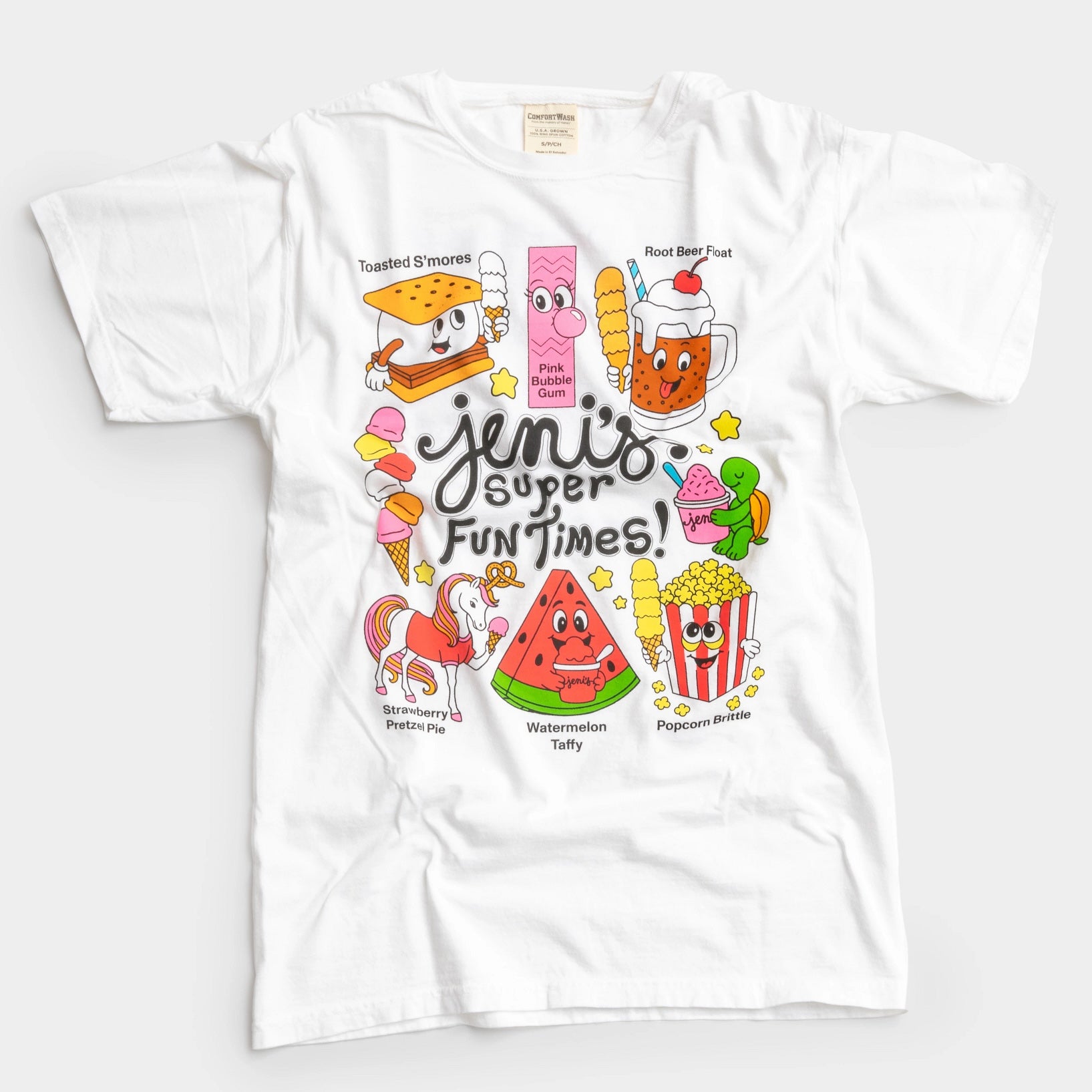 Tell the world you had a SUPER FUN TIME! Our latest T-shirt features the nostalgic cartoon mascots of our summer collection (dreamed up by the Jeni’s Art + Design team). In classic comfy 100% cotton — perfect for every summer adventure.