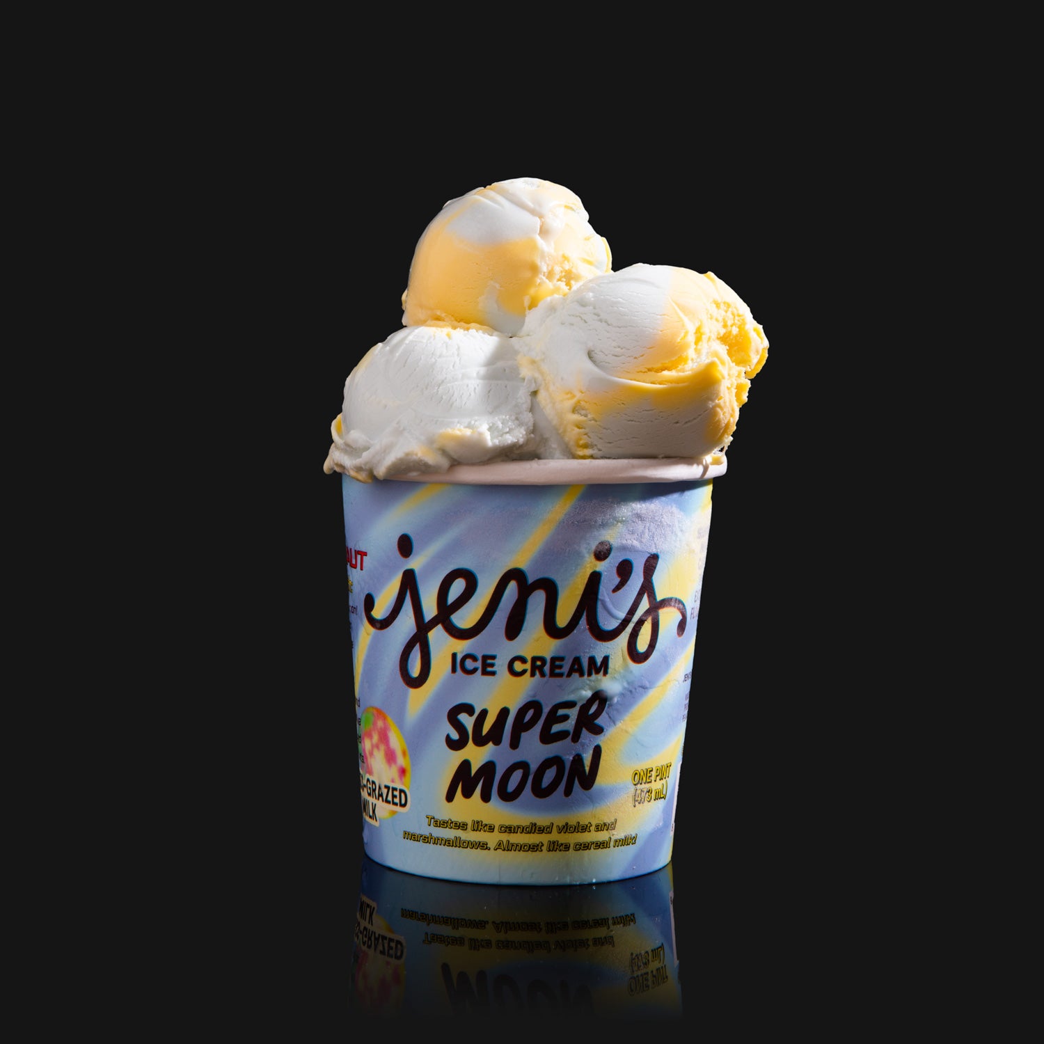 Supermoon is a dreamy blend of two marshmallow flavors. The yellow half is classic marshmallow. while the blue half is candied violet — which Jeni has always thought tastes like cereal marshmallows. Swirl them together and you get a gorgeous. smooth ice cream with nostalgic. almost candy-like sweetness and a delicate floral finish. First introduced in 2017. Supermoon has become one of our most fervently requested bring-back flavors. We’re over the (super)moon to reintroduce it as part of our Punk Stargonaut collection: flavors inspired by a fictional flight through the galaxy.